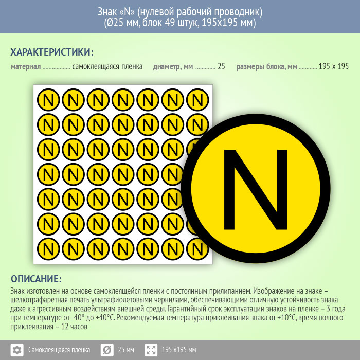 Знак (плакат) «N» (нулевой рабочий проводник), S47 (пленка, диаметр 25 мм, блок 49 штук, 195х195 мм) в Химках купить