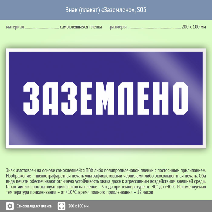 Знак (плакат) «Заземлено», S05 (пленка, 200х100 мм) в Химках купить