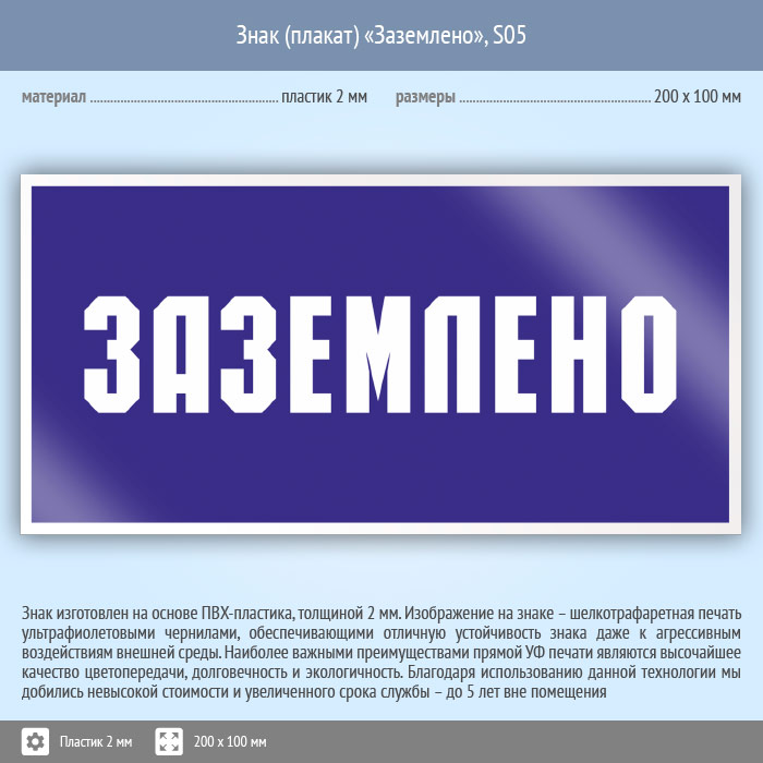 Знак (плакат) «Заземлено», S05 (пластик, 200х100 мм) в Химках купить