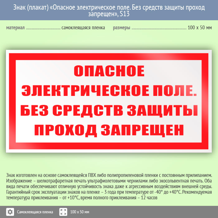 Знак (плакат) «Опасное электрическое поле. Без средств защиты проход запрещен», S13 (пленка, 100х50 мм) в Химках купить