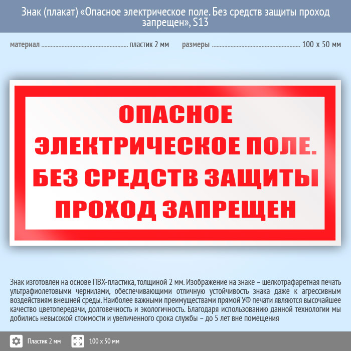 Знак (плакат) «Опасное электрическое поле. Без средств защиты проход запрещен», S13 (пластик, 100х50 мм) в Химках купить