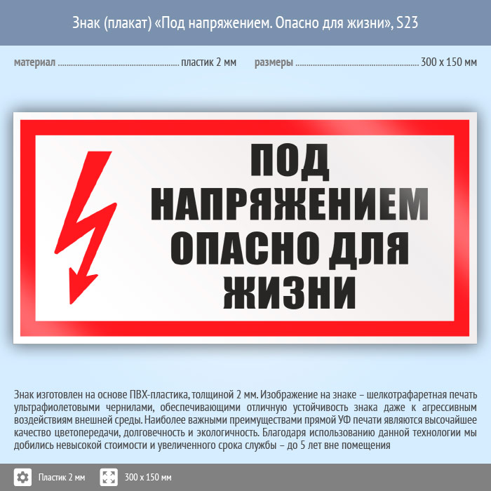 Знак (плакат) «Под напряжением. Опасно для жизни», S23 (пластик, 300х150 мм) в Химках купить