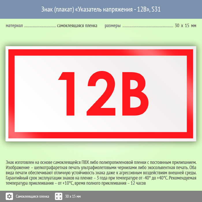 Знак (плакат) «Указатель напряжения 12 В», S31 (50 штук, пленка, 30х15 мм) в Химках купить