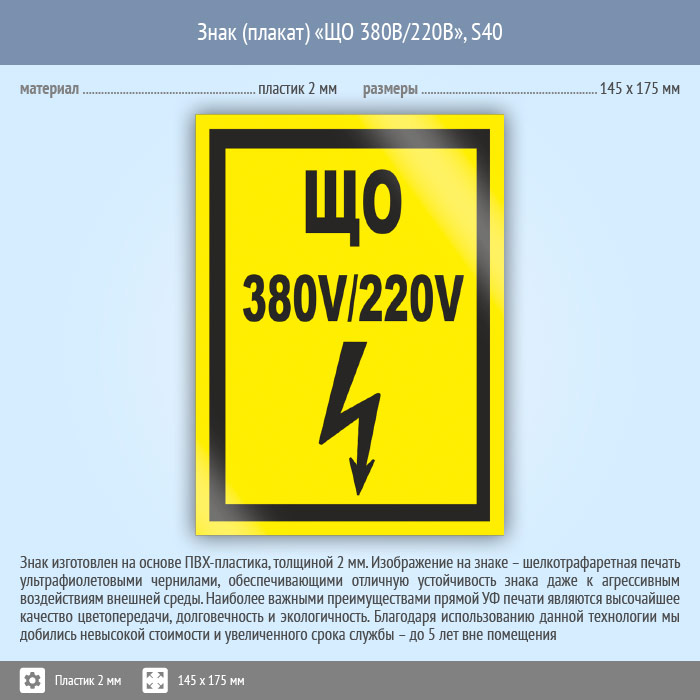 Знак (плакат) «ЩО 380В/220В», S40 (пластик, 145х175 мм) в Химках купить