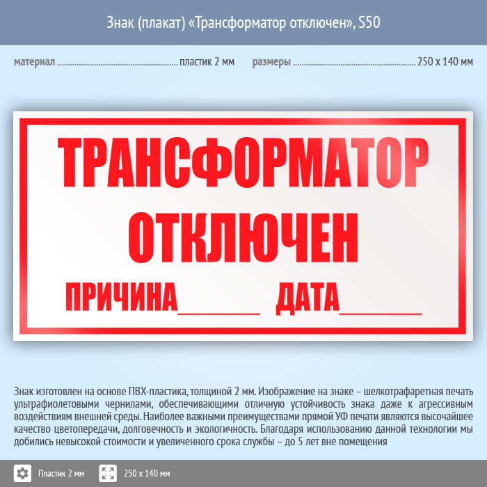 Знак (плакат) «Трансформатор отключен», S50 (пластик, 250х140 мм) в Химках купить