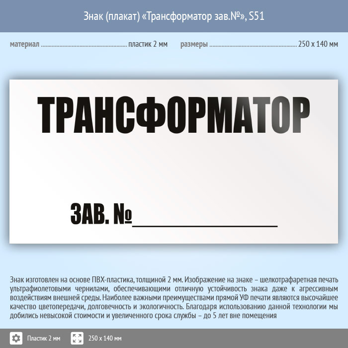 Знак (плакат) «Трансформатор зав.№», S51 (пластик, 250х140 мм) в Химках купить