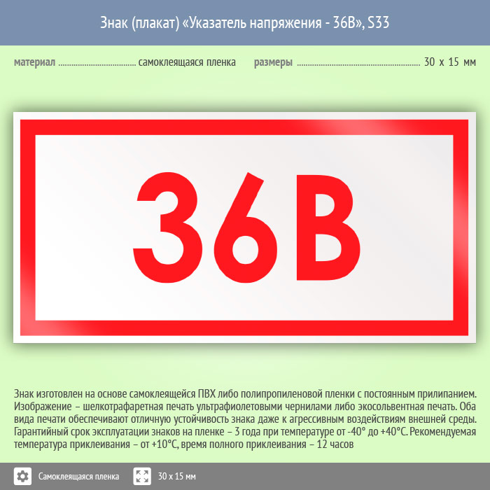 Знак (плакат) «Указатель напряжения - 36В», S33 (50 штук, пленка, 30х15 мм) в Химках купить