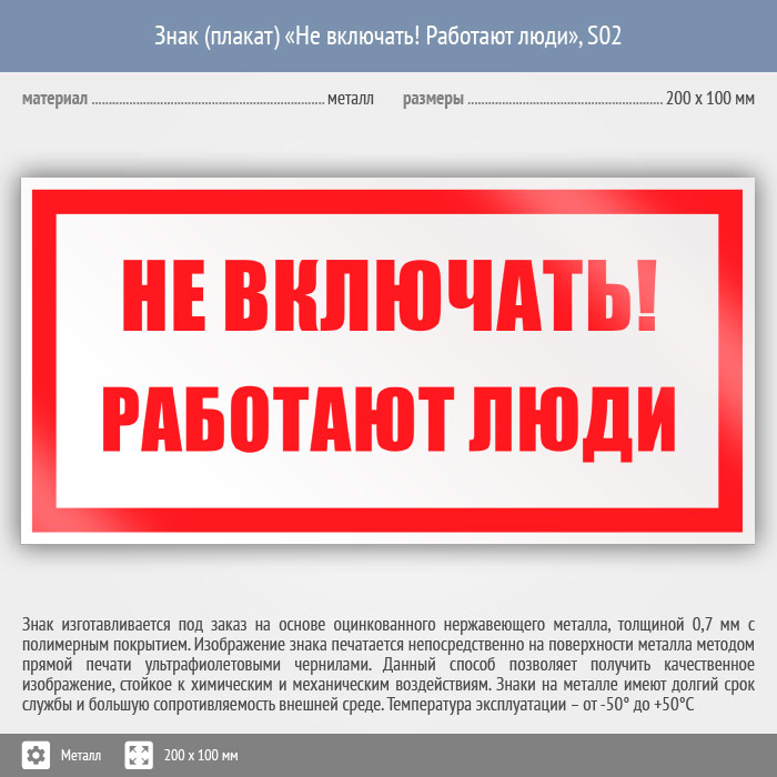 Знак (плакат) «Не включать! Работают люди», S02 (металл, 200х100 мм) в Химках купить