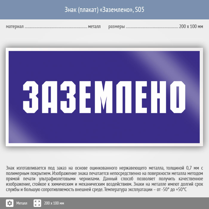Знак (плакат) «Заземлено», S05 (металл, 200х100 мм) в Химках купить