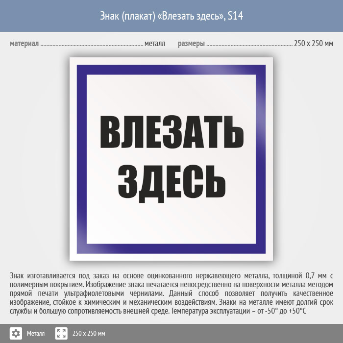 Знак (плакат) «Влезать здесь», S14 (металл, 250х250 мм) в Химках купить
