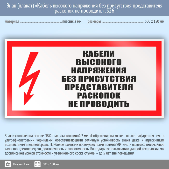 Знак (плакат) «Кабель высокого напряжения без присутствия представителя раскопок не проводить», S26 (пластик, 300х150 мм) в Химках купить