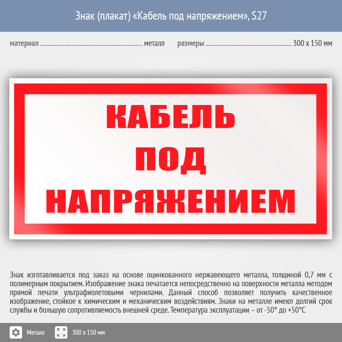 Знак (плакат) «Кабель под напряжением», S27 (металл, 300х150 мм) в Химках купить