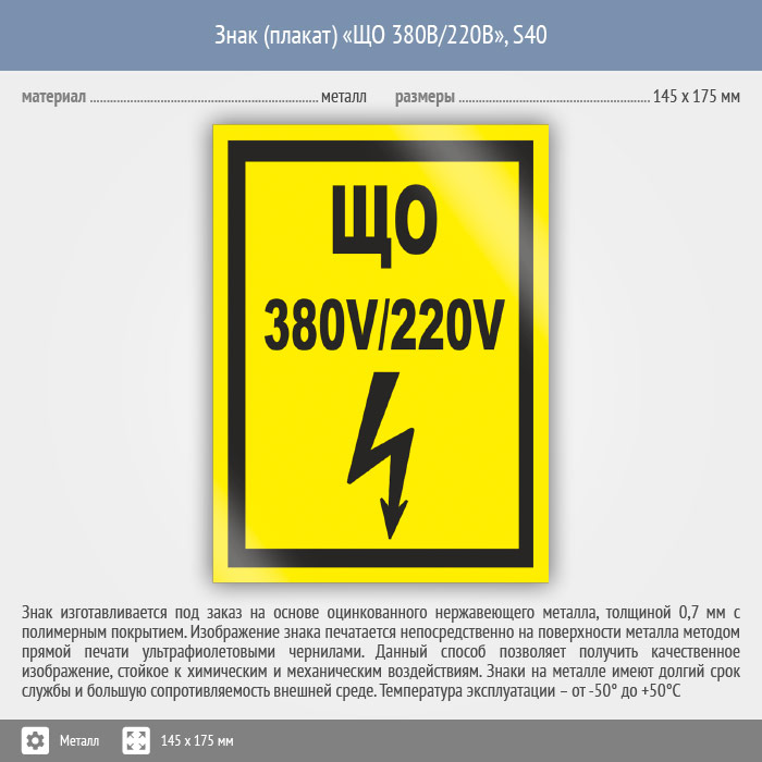 Знак (плакат) «ЩО 380В/220В», S40 (металл, 145х175 мм) в Химках купить