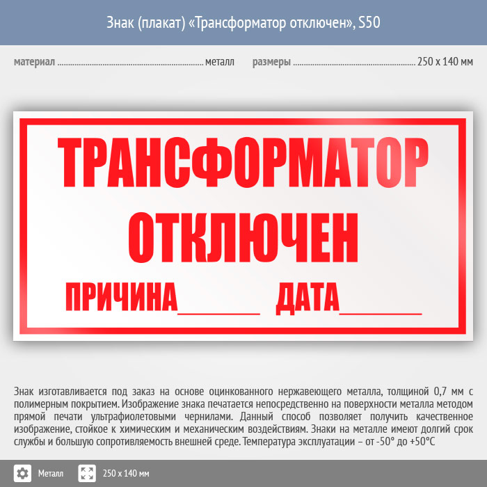 Знак (плакат) «Трансформатор отключен», S50 (металл, 250х140 мм) в Химках купить