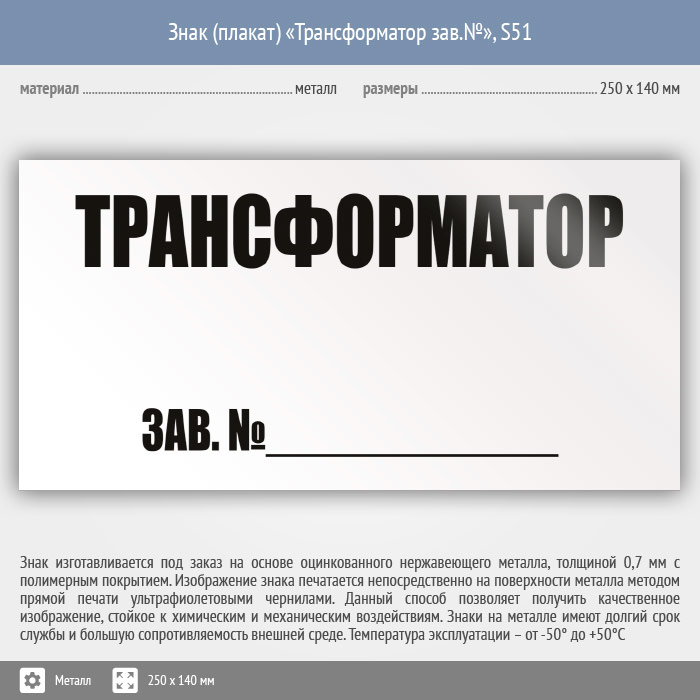 Знак (плакат) «Трансформатор зав.№», S51 (металл, 250х140 мм) в Химках купить
