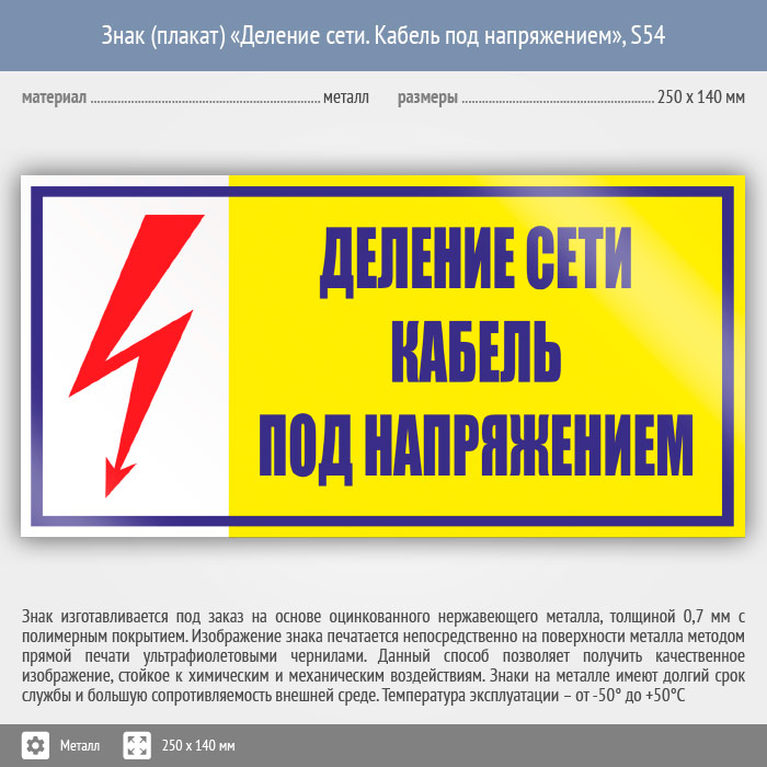 Знак (плакат) «Деление сети. Кабель под напряжением», S54 (металл, 250х140 мм) в Химках купить