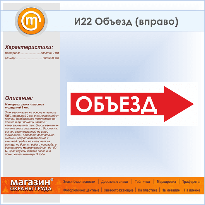 Знак «Объезд (вправо)», И22 (пластик, 600х200 мм) в Химках купить