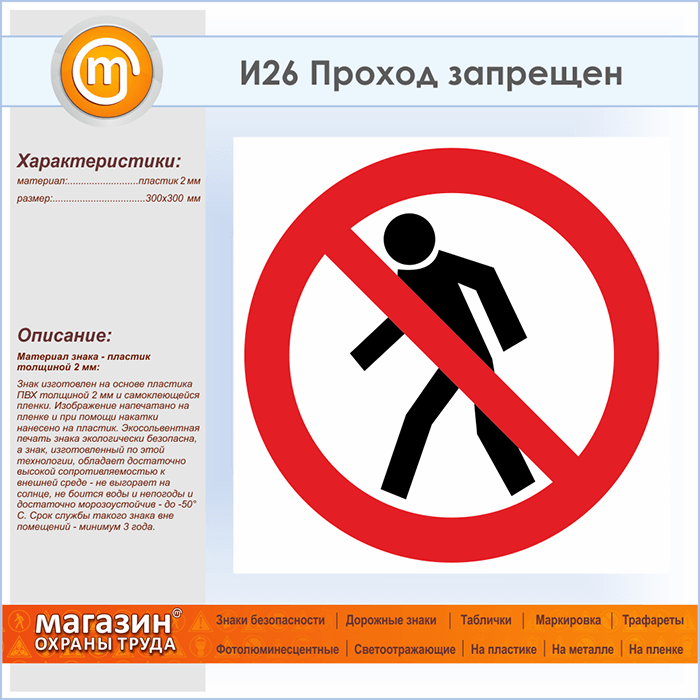 Знак «Проход запрещен», И26 (пластик, 300х300 мм) в Химках купить