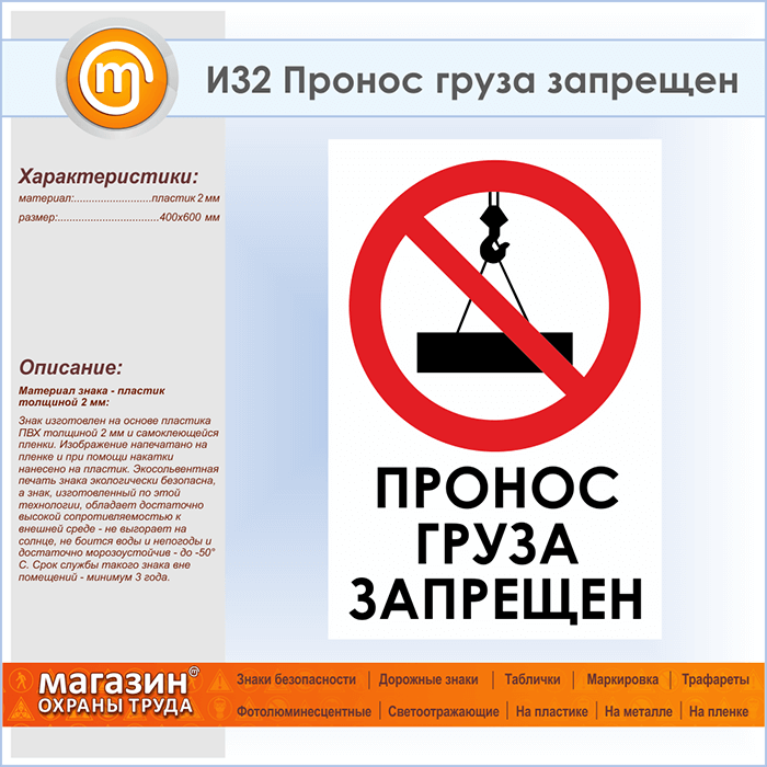 Знак «Пронос груза запрещен», И32 (пластик, 400х600 мм) в Химках купить