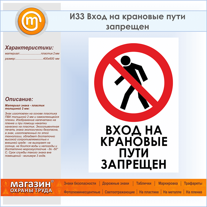 Знак «Вход на крановые пути запрещен», И33 (пластик, 400х600 мм) в Химках купить