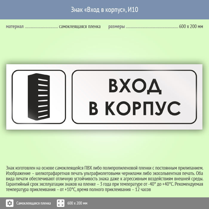 Знак «Вход в корпус», И10 (пленка, 600х200 мм) в Химках купить