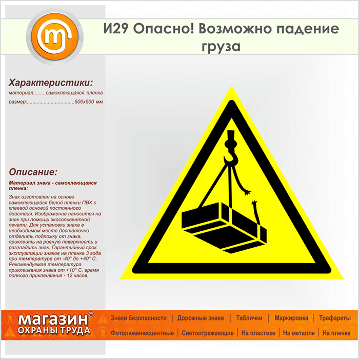 Знак «Опасно! Возможно падение груза», И29 (пленка, сторона 500 мм) в Химках купить