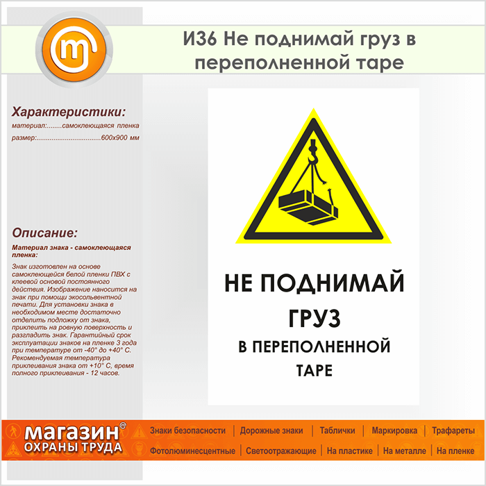 Знак «Не поднимай груз в переполненной таре», И36 (пленка, 600х900 мм) в Химках купить