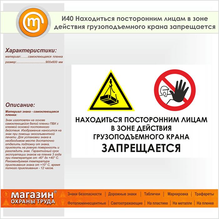 Знак «Находиться посторонним лицам в зоне действия грузоподъемного крана запрещается», И40 (пленка, 900х600 мм) в Химках купить