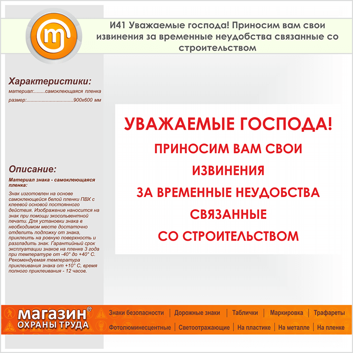 Знак «Уважаемые господа! Приносим вам свои извинения за временные неудобства, связанные со строительством», И41 (пленка, 900х600 мм) в Химках купить
