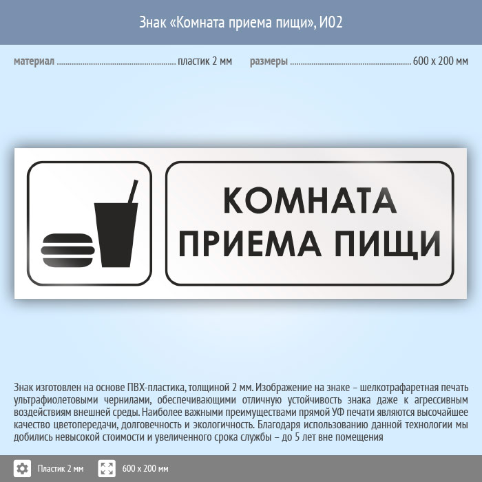 Знак «Комната приема пищи», И02 (пластик, 600х200 мм) в Химках купить