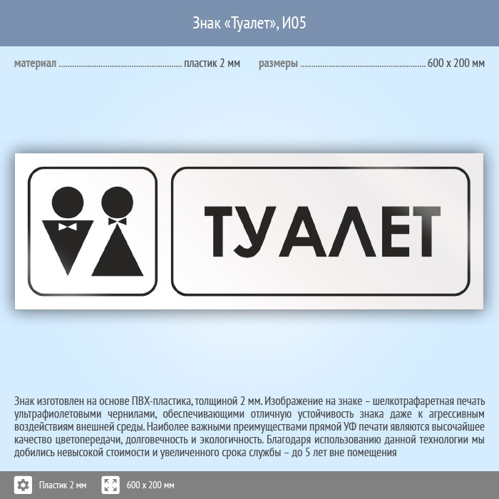 Знак «Туалет», И05 (пластик, 600х200 мм) в Химках купить