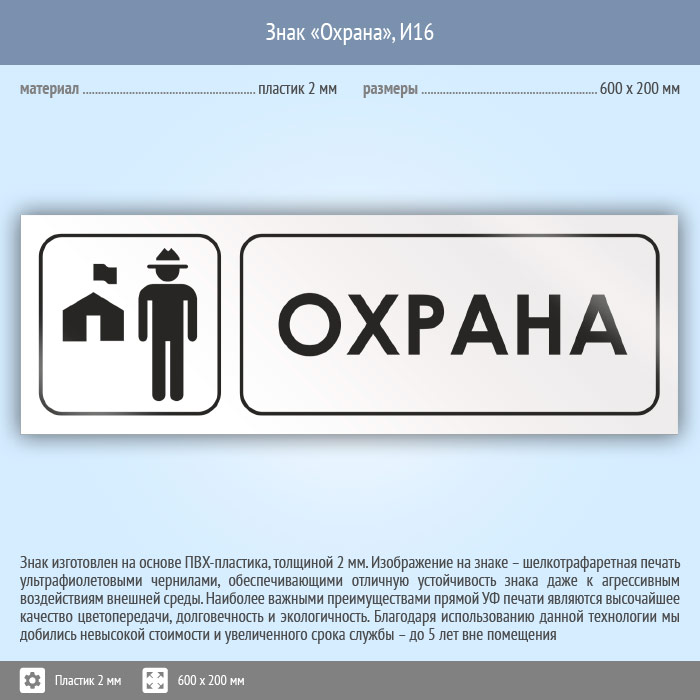 Знак «Охрана», И16 (пластик, 600х200 мм) в Химках купить