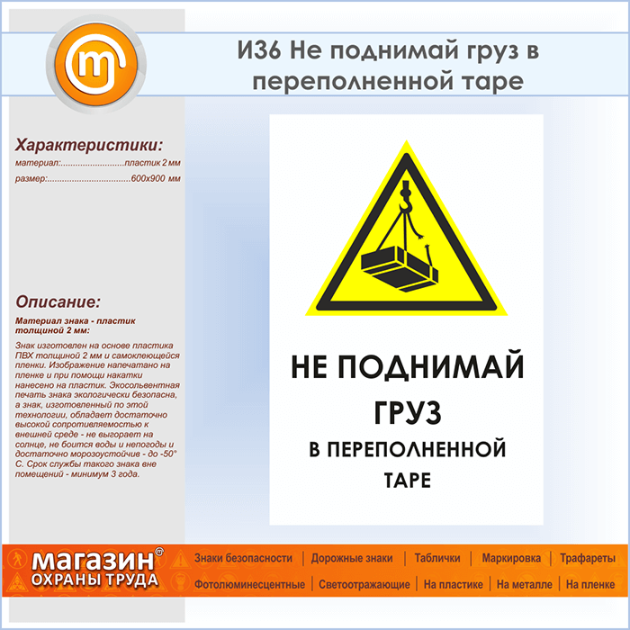 Знак «Не поднимай груз в переполненной таре», И36 (пластик, 600х900 мм) в Химках купить