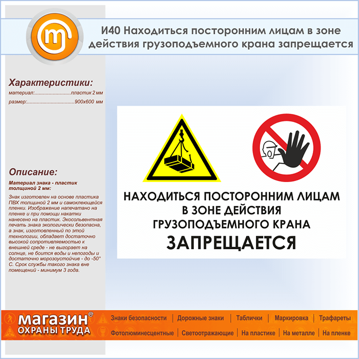 Знак «Находиться посторонним лицам в зоне действия грузоподъемного крана запрещается», И40 (пластик, 900х600 мм) в Химках купить