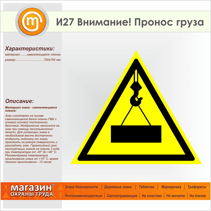 Знак «Внимание! Пронос груза», И27 (пленка, сторона 700 мм) в Химках купить