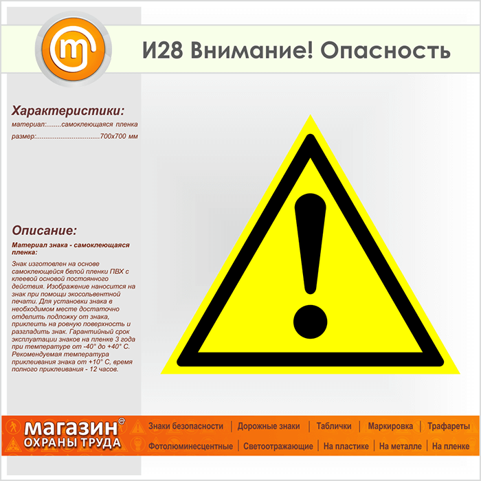 Знак «Внимание! Опасность», И28 (пленка, сторона 700 мм) в Химках купить