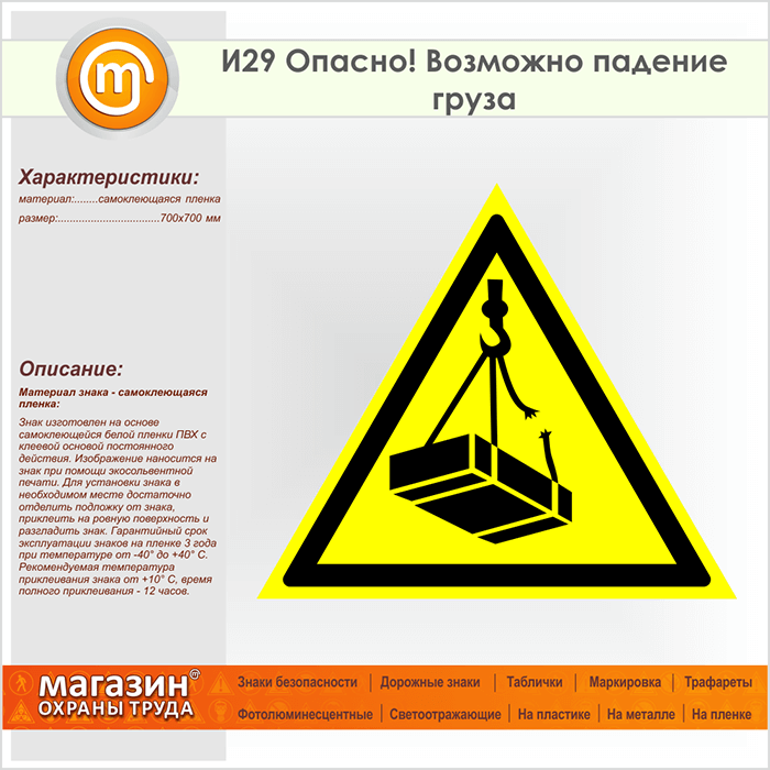 Знак «Опасно! Возможно падение груза», И29 (пленка, сторона 700 мм) в Химках купить