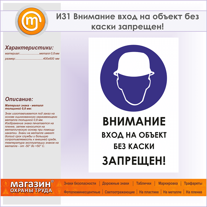 Знак «Внимание вход на объект без каски запрещен!», И31 (металл, 400х600 мм) в Химках купить