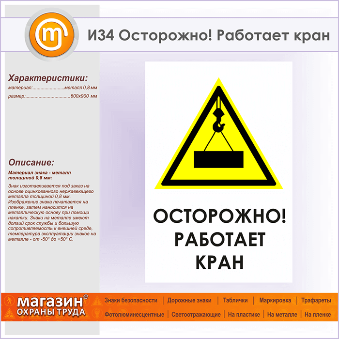 Знак «Осторожно! Работает кран», И34 (металл, 600х900 мм) в Химках купить