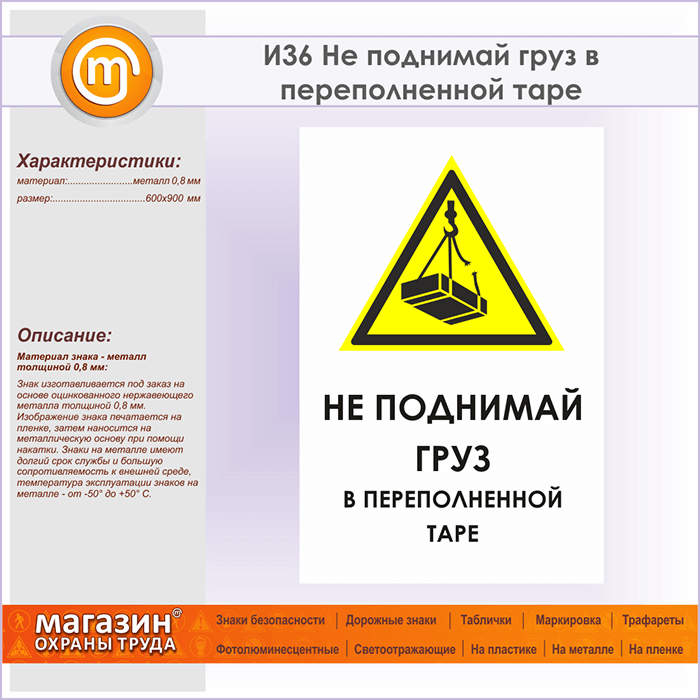 Знак «Не поднимай груз в переполненной таре», И36 (металл, 600х900 мм) в Химках купить