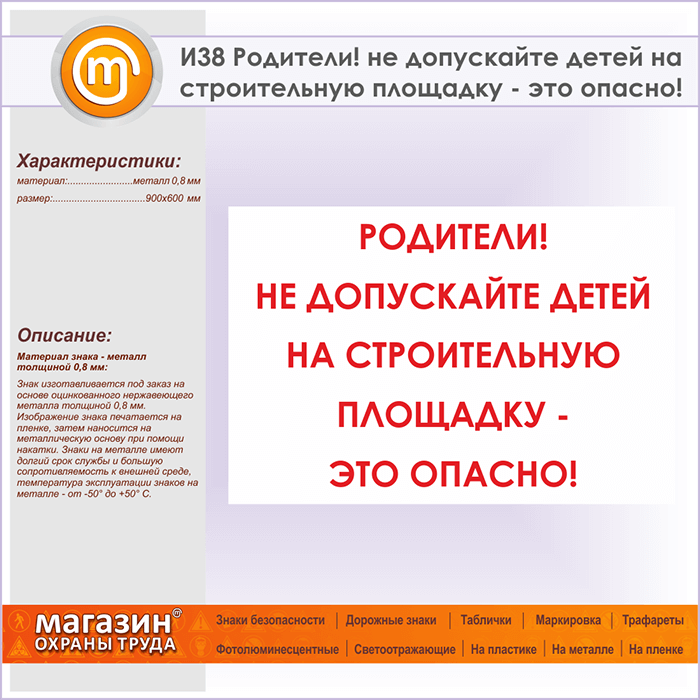 Знак «Родители! не допускайте детей на строительную площадку - это опасно!», И38 (металл, 900х600 мм) в Химках купить