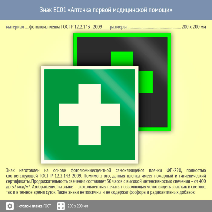 Знак EC01 «Аптечка первой медицинской помощи» (фотолюминесцентная пленка ГОСТ 34428-2018, 200х200 мм) в Химках купить