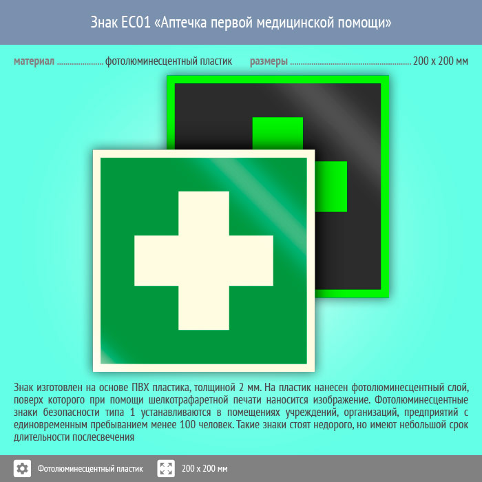 Знак EC01 «Аптечка первой медицинской помощи» (фотолюминесцентный пластик, 200х200 мм) в Химках купить