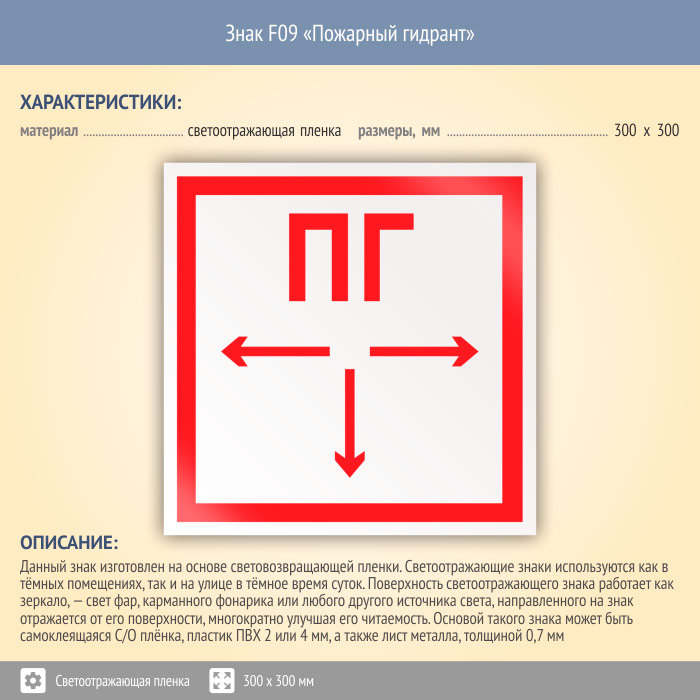 Знак F09 «Пожарный гидрант» (светоотражающая пленка, 300х300 мм) в Химках купить