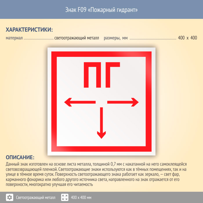 Знак F09 «Пожарный гидрант» (светоотражающий металл, 400х400 мм) в Химках купить