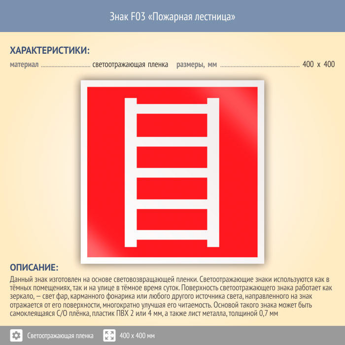 Знак F03 «Пожарная лестница» (светоотражающая пленка, 400х400 мм) в Химках купить