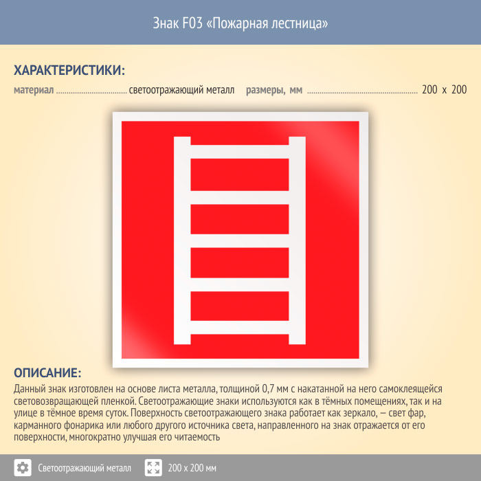 Знак F03 «Пожарная лестница» (светоотражающий металл, 200х200 мм) в Химках купить