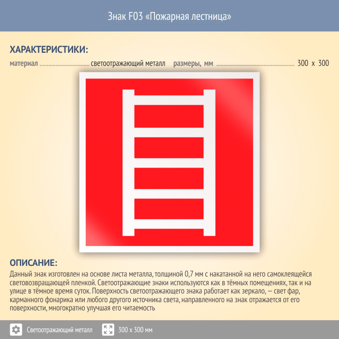 Знак F03 «Пожарная лестница» (светоотражающий металл, 300х300 мм) в Химках купить