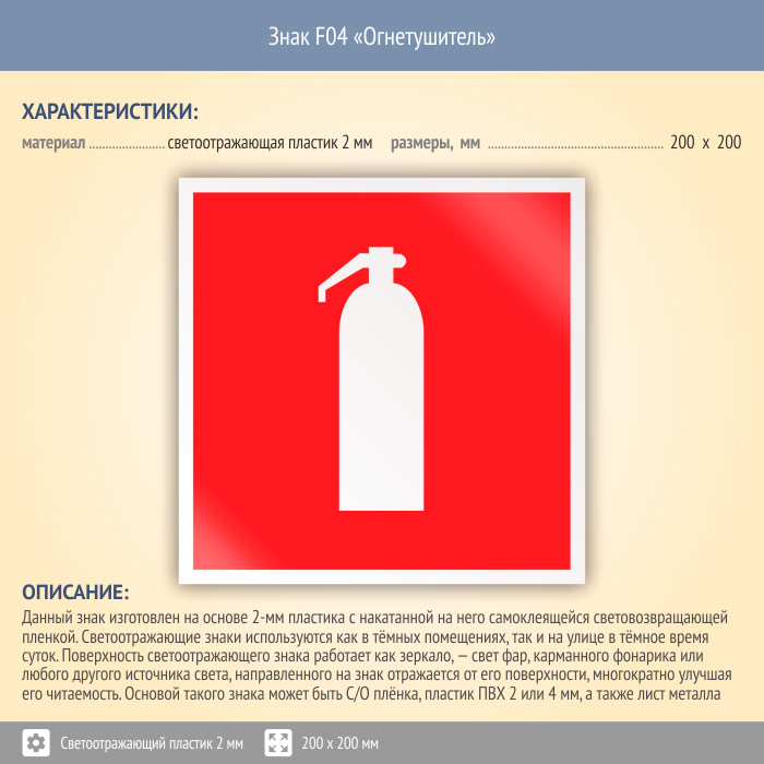 Знак F04 «Огнетушитель» (светоотражающий пластик, 200х200 мм) в Химках купить