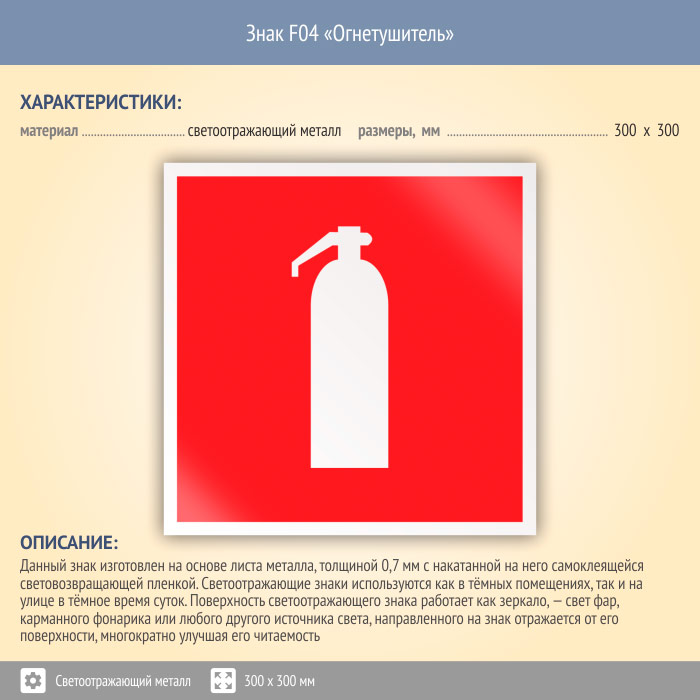 Знак F04 «Огнетушитель» (светоотражающий металл, 300х300 мм) в Химках купить
